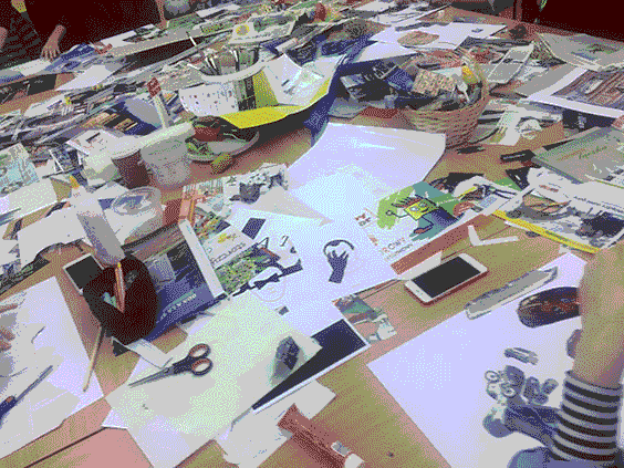 Uczniowie podzieleni na dwie grupy tworzą wzory wg zadanego tematu na materiale o wymiarach 1,5x1,5m. Odszukują postacie lub przedmioty z wcześniej dość chaotycznie rozlanej farby. Praca w grupie wywołuje duże emocje oraz pobudza kreatywność. Przede wszystkim uczy wspólnego działania oraz brania odpowiedzialności za decyzje.